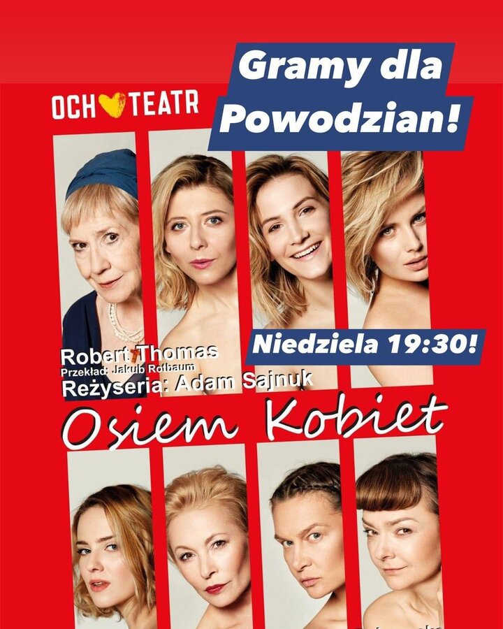 poruszeni kataklizmem na południu Polski, dochód ze sprzedaży biletów na dzisiejszy (29 września) spektakl OSIEM KOBIET w reż. Adama Sajnuka przeznaczymy na pomoc dla osób dotkniętych powodzią w Lądku-Zdroju. Jest to miejsce dla nas szczególne, to tam odbyła się pierwsza edycja Festiwalu Krystyny Jandy, a my wielokrotnie gościliśmy w tym pięknym miejscu.